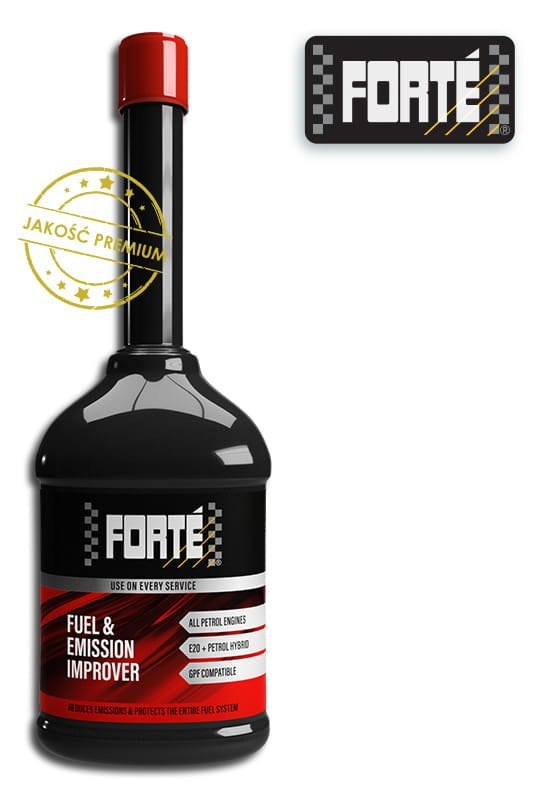 Forté Fuel & Emission Improverzapewnia czyszczenie katalizatora, sondy lambda, filtra GPF i pierścieni uszczelniających cylindry w silnikach benzynowych.