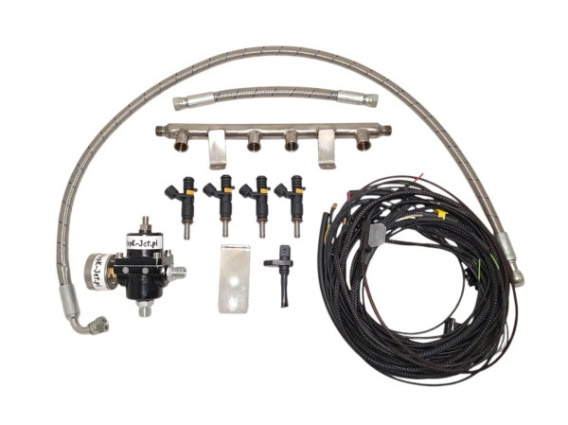 Zestaw obejmuje listwę wtryskową, regulator ciśnienia paliwa, wtryskiwacze paliwowe (4 sztuki), gniazda wtryskowe (4 sztuki), przewody podciśnienia oraz wiązkę kablową w peszlu zakończoną odpowiednimi wtyczkami i pinami do podłączenia do nowego sterownika silnika. Dzięki temu masz pewność, że otrzymujesz kompletny pakiet niezbędnych elementów.